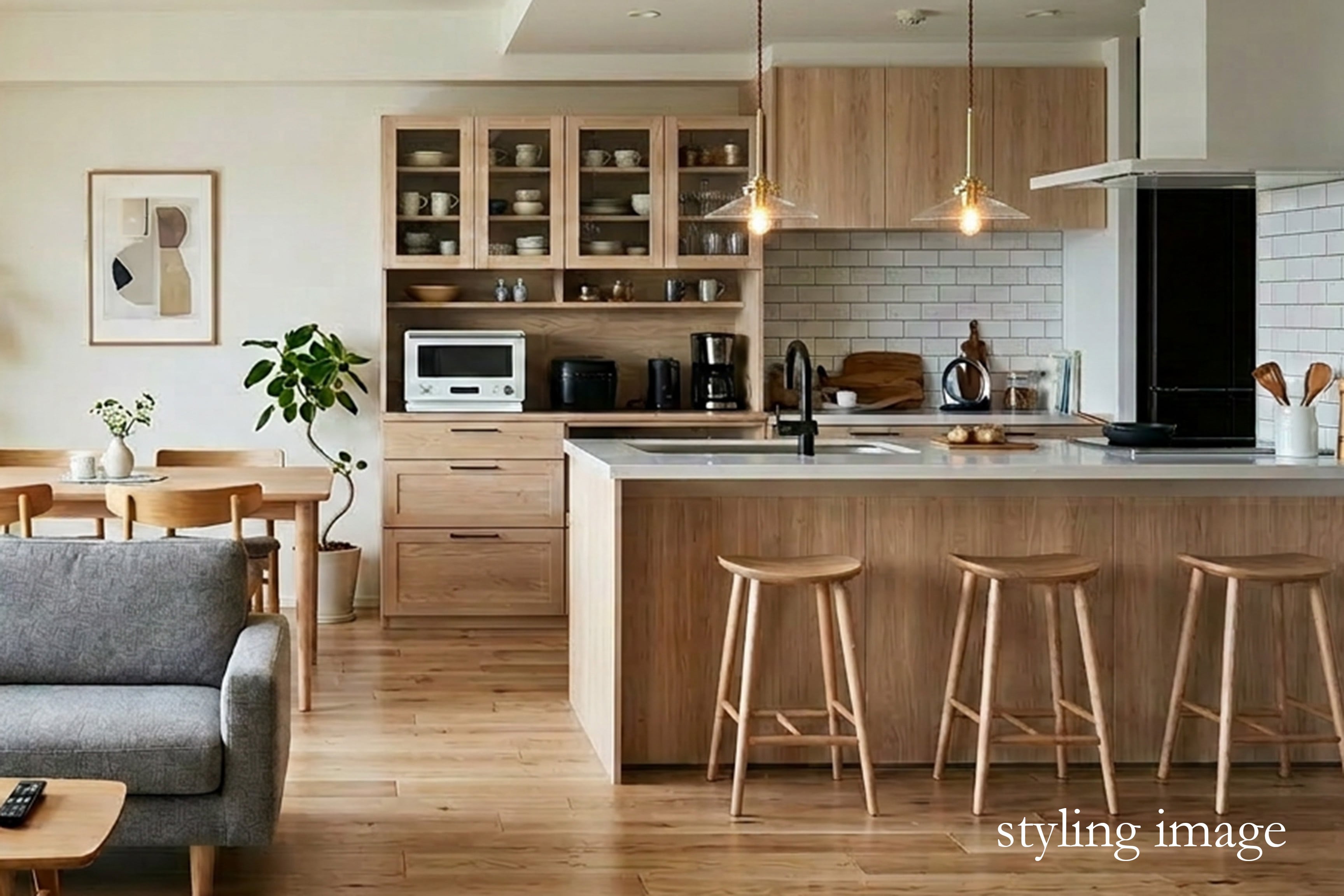 ダイニングテーブルやキッチンカウンターの上に複数吊りするのもおすすめ。